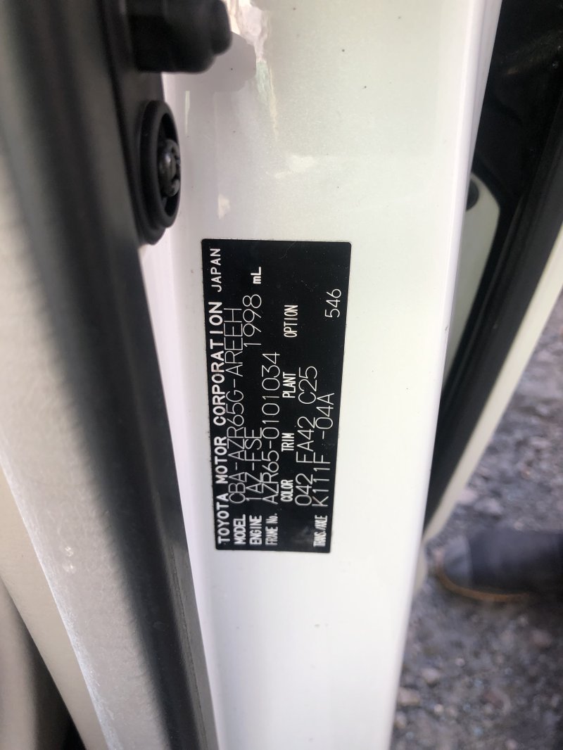 | Год регистрации | 2004 / 11 |  | Класс | N/A |  | Тип двигателя | 1AZ |  | Коробка передач | Автоматическая |  | Топливо | Бензин |  | Вместимость | 8 пассажиров |  | Цвет | PAERL |  | Шасси | AZR65-0101034 |  |  |